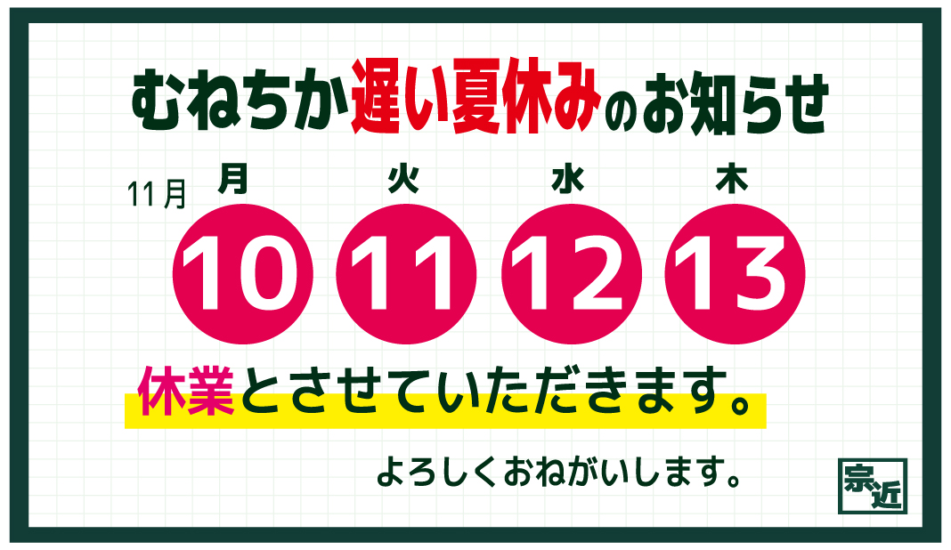 お知らせ2025.11.08遅い夏休みのお知らせ ポスト シェア はてブ 送る 毎度お世話になっております。 むねちかは今月11月10日㈪~14㈭まで夏休みをいただきます。 冬が近づいていますが夏休みです。 よろしくお願いします。