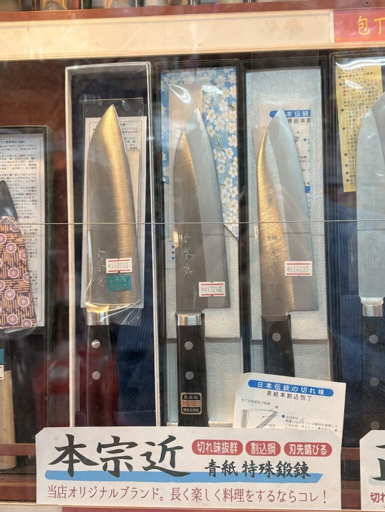 むねちかでまずオススメしているのはオリジナルブランドの「本宗近」です。文化包丁ではステンレスか刃先だけを鋼にしている本割込を用意しています。家庭で使うなら結局手入れの簡便さは大事です。この包丁も刃先は黒く錆びますが匂い移りするものではありません。また、硬度が高く耐摩耗性に優れ、鋭い切れ味が永く続きます。包丁ってちゃんと研げば大体のものは最初は切れ味は良くなるんです。そこから長くそこそこの切れ味を維持できるかという点において青紙は一つ抜けていると思います。